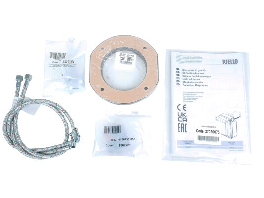 В основной комплект жидкотопливной горелки включены: фланец для монтажа на котел, изоляционная прокладка, крепеж, 2 гибких шланга, 2 ниппеля, 7-контактный разъем.