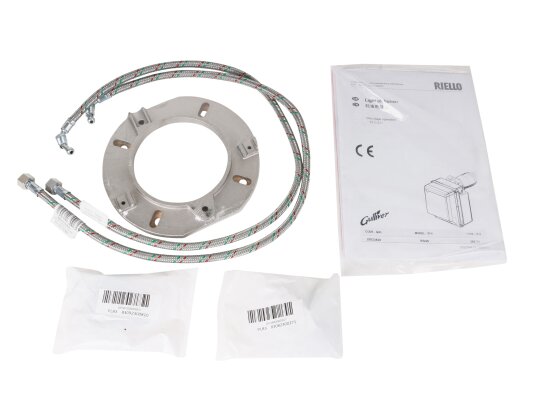 Дизельная горелка Riello Gulliver RG4S укомплектована двумя гибкими шлангами, штуцерами, монтажным фланцем, крепежными элементами, теплоизоляционной прокладкой, 7-штырьковым штекером, технической документацией. Дополнительно предоставляется форсунка, подогреватель топлива и другие устройства.