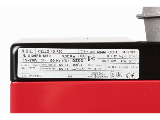 - Горелка Riello F20 оснащена шестеренчатым насосом с фильтром и регулятором. Топливную смесь можно подводить слева или справа. Для распыления топлива, нагнетаемого насосом, требуется докупить форсунку с учетом мощности эксплуатации горелки.